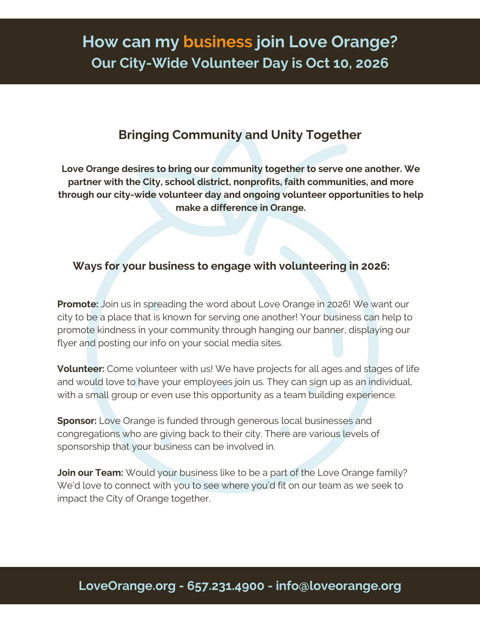 Want to help bring our community together? There's opportunities for your business to be involved whether promoting, volunteering, leading a project or by being a sponsor. Let's connect and see what kind of impact you'd like to make.